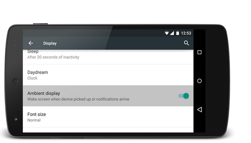 Ambient display is a dedicated feature included on the new Motorola Google Nexus 6. The same feature was first introduced with the first generation of Motorola Moto X, so we are talking about a Moto branded software and not about a Lollipop dedicated app. Thus, you will not get Ambient Display by default on your Android 5.0 powered smartphones and tablets.