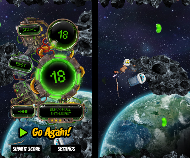 The action in this particular setting is the sequel to one of the episodes. Long story short: they had a space-ship. MO used all the parts of the space ship to repair an orbital station, and now they have to travel back home on a rusty piece of junk, using MO’s “bowl reactor” to navigate.Tap to play – you only have 5 taps, so be sure to collect the space beans to refuel. You only score points by collecting beans. At the 20 bean mark… there’s a secret bean (not so secret now, is it?) – that does something useful (gotta love all the mistery).