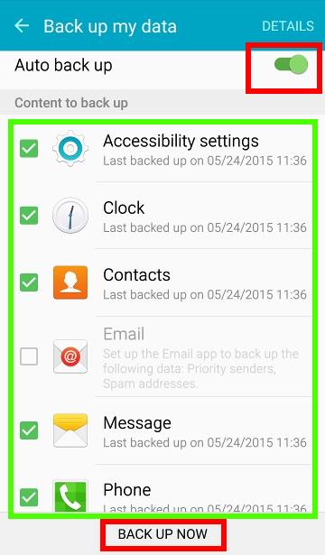 - You are redirected to the Backup my data page from where you can enable auto backup Galaxy S6 6o Samsung servers;