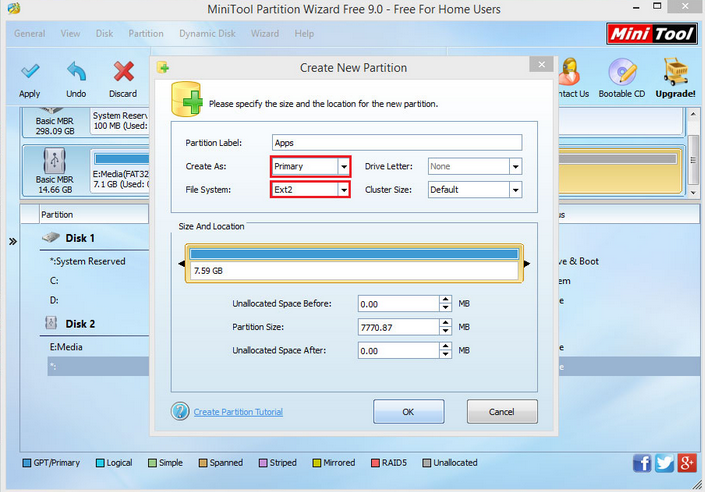 - When the New partition dialog box appears, don’t hesitate to select it as primary partition with FAT32 File system;