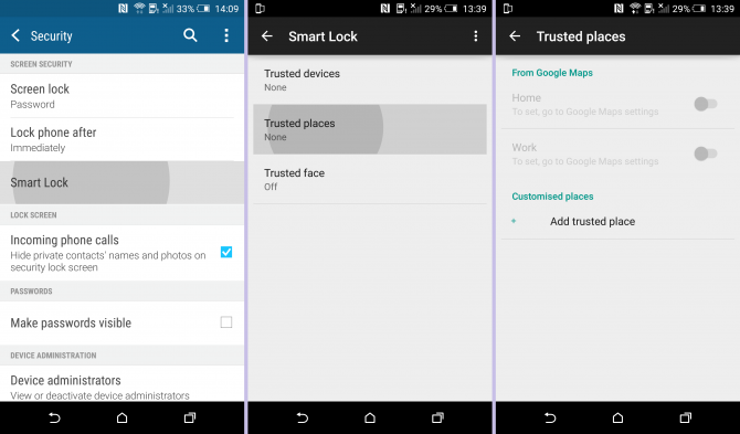 Android uses your GPS location to power the Trusted places. This Smart lock is the one that runs in the background and there are big chances not to be noticed as long as it relies on zero input from the user, but the location services must be turned on. In such a situation, Trusted Places lets you unlock your One M9 once you enter a ‘safe zone’ picked out on a map. So, don’t hesitate to set up zones for home and work; whenever you will leave these places, your phone will automatically lock itself.