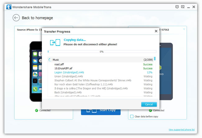 - MobileTrans will show you a list of music in your old iPhone, so choose the songs that you want;