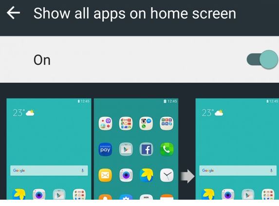 - At this point you have to touch the “Show all apps on home screen” option and make sure to toggle it ON. This will refresh your home screen and get rid of the app drawer;