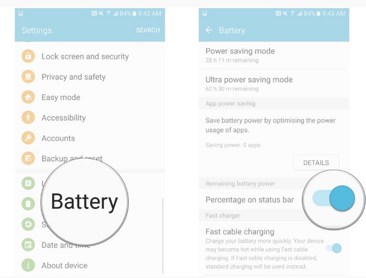 The remaining battery power is not shown on the notification bar in the Galaxy S7, but you already know what steps to take in order to show Galaxy S7 Battery Percentage. Knowing exactly how much battery you have left is handy, but I must also admit the fact that there are situations when a clean notification bar is better.