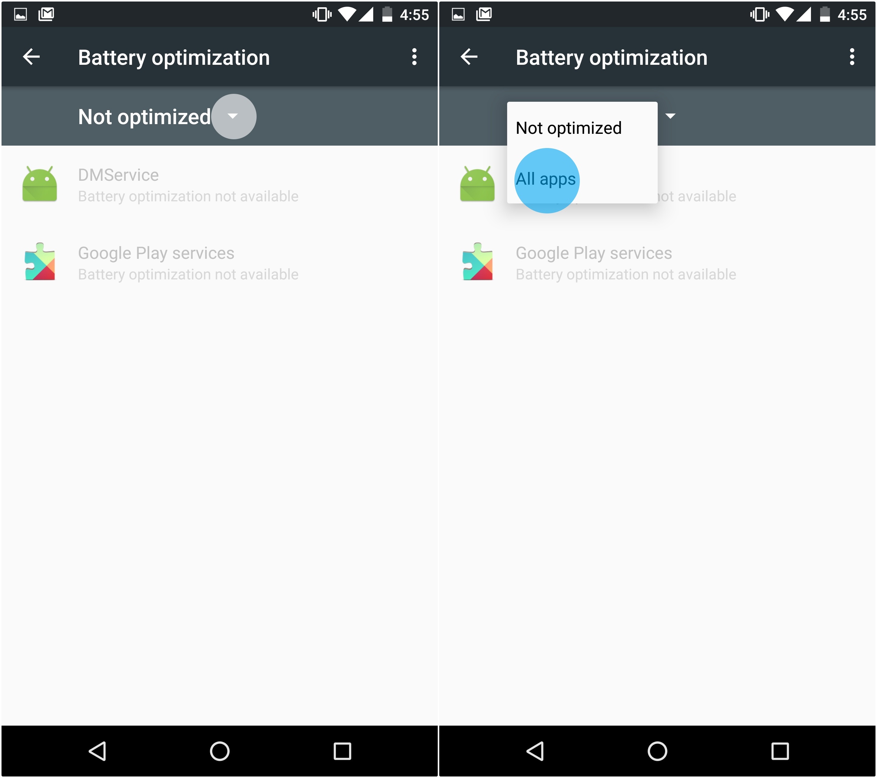 - All the applications are toggled to On, meaning that the Doze feature works for them. Toggle them to Off and the problem will be solved;