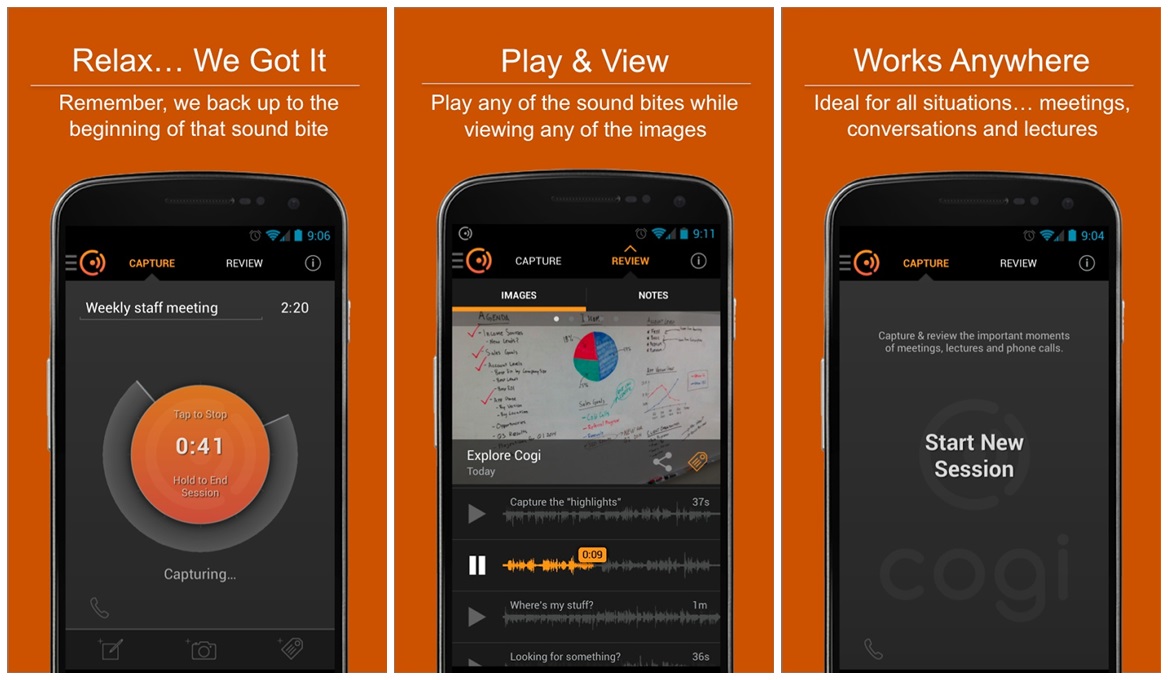 The free Android app Cogi Voice Recorder, short for cogent ideas, may be just what you’re looking for if you are no afraid of something different. This app seems to have more than you could be expecting. When you start a session in Cogi it starts to ‘listen’ without saving anything at this point. The magic comes when you decide you want to remember what is being said. Simply ‘Tap to Highlight’, and like that, the app starts to record until you tap it again to pause recording, at which point it resumes listening.