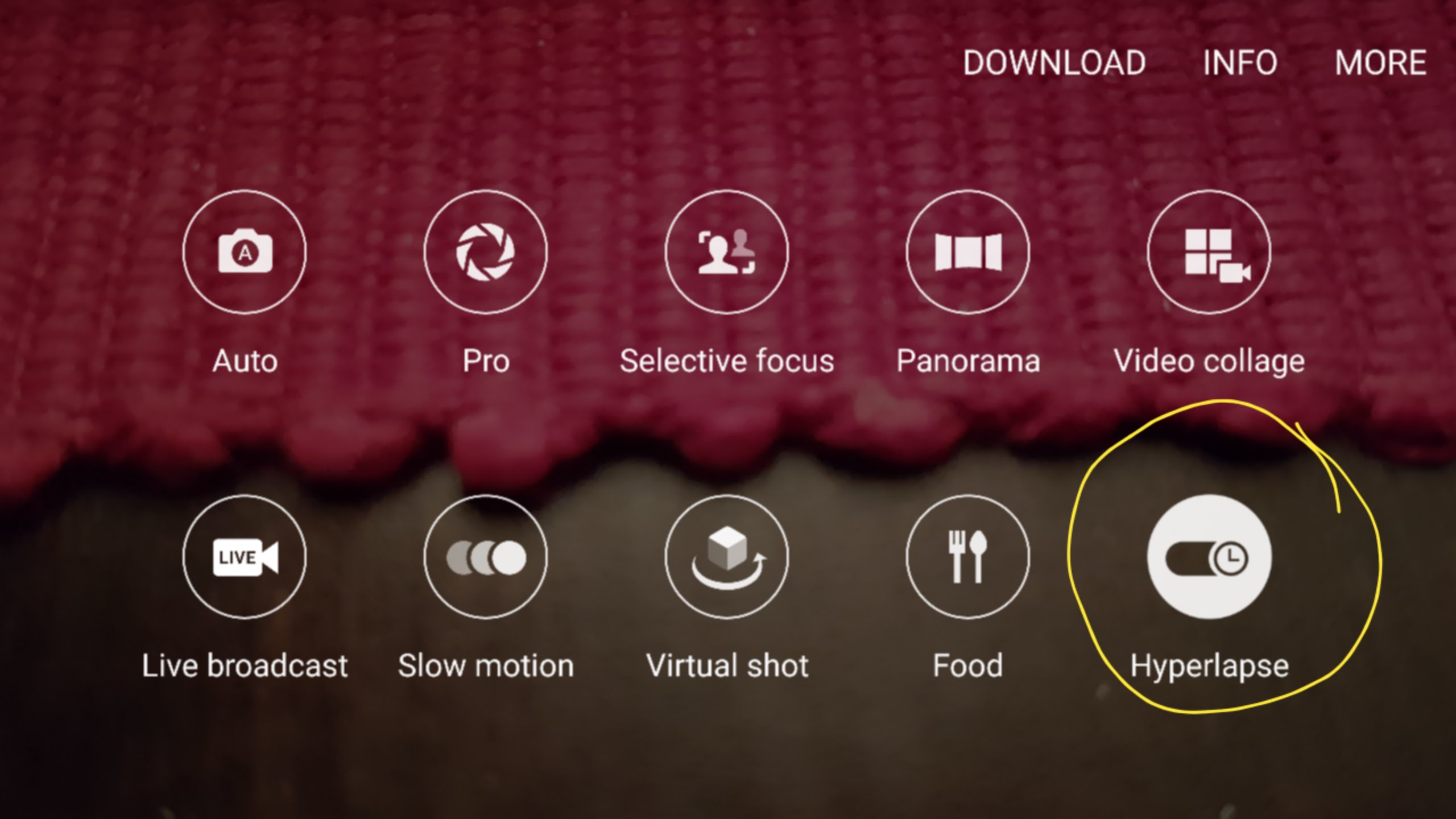 - From the available camera modes, select the Hyperlapse mode (in case of not knowing where to look, this should be found on the bottom right of the screen);