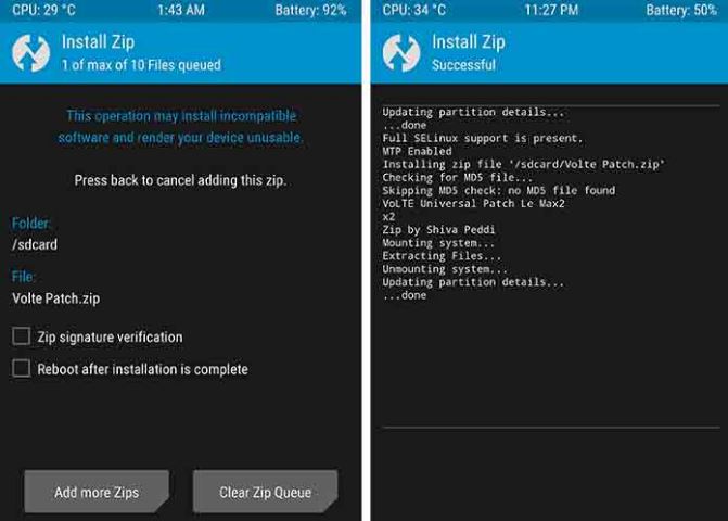 - Browse the storage and select the Volte Patch.zip file and confirm the flashing procedure;