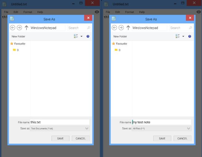 - Go to File>Save to save your text file. By default, the file saves as a TXT file. If you want to save a file with a different extension, tap the ‘Save As’ drop-down in the Save dialogue box. Select ‘All files (*.*)’ from the drop-down and give your file any extension you want. You can save a file to the app’s root or you can create a new folder to save the file;