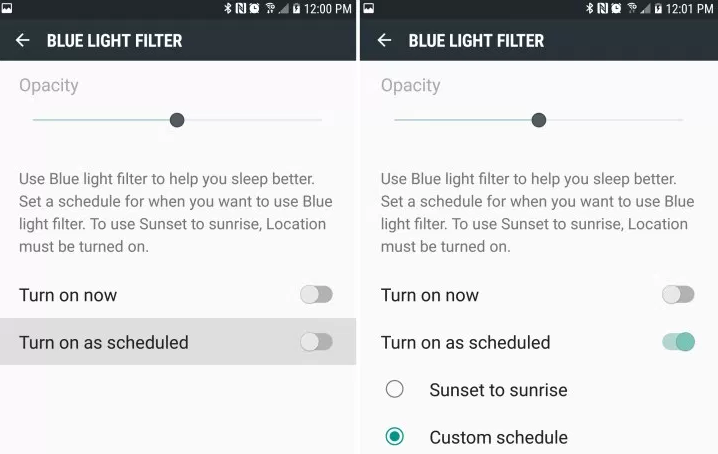 - To enable the feature, you must simply tap it, and the screen will deliver less blue light to your eyes. You’ll immediately see that the Note 8 screen has turned yellowish and that the Blue light is completely removed from the Infinity display. You’ll see an amber or reddish tint on the screen and adjusting the slider will add more or less of the filter, for a user’s specific preference.