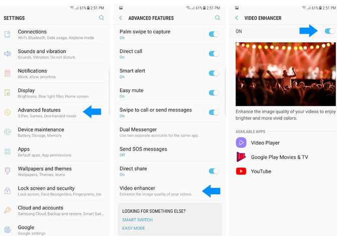 - That section also leads to a page with a list of available apps which are compatible with the Video enhancer feature. You must just toggle the switch located near the top right of the screen to enable Video enhancer.