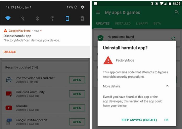 OnePlus 3 and 3T devices are both getting a lot of attention these days. Well, users of these handsets started to get the OxygenOS 5.0.1 update, but things are far from perfect. It seems that the changes are not playing too nice with Google Play Protect, which is asking users to uninstall FactoryMode. Is this happening top you too? Then, I bet that you are looking for a way to solve Factory Mode Harmful App Warning on OxygenOS 5.0.1.