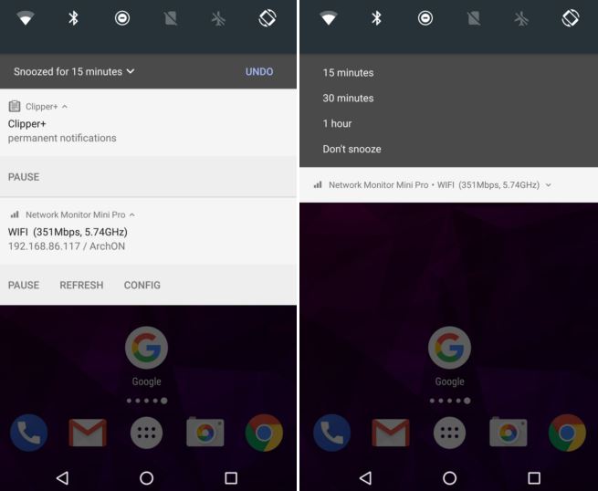 If 15 minutes isn’t enough, you can tap the time right after snoozing and open the selector. It seems that in the status bar, when you swipe a notification to the side, you will be provided with no less than four options – to snooze it for 15 minutes, 30 minutes or an hour; tap any one of these to snooze that notification for the specified time.