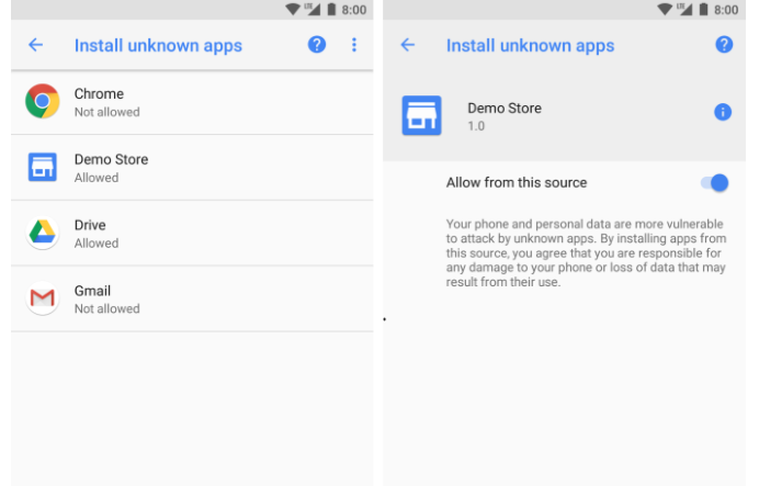 To sideload an app, you previously had to enter into “Settings”, tap “Security” and allow installation of apps from unknown sources. With Oreo, this isn’t possible any longer. After some digging, I discovered that the feature you knew has been replaced with something that lets you control which app gets access to the installation of unknown APKs and which do not.