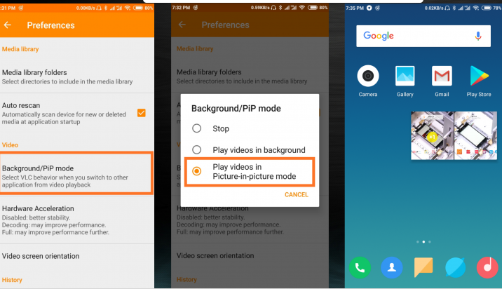 - Now, it’s time to check the app’s own setting to enable PIP mode (such as VLC – Preferences – BG/PIP mode – Play in PIP mode);
