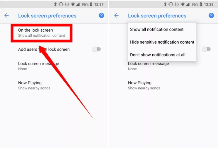 4. At the top of the list, you should see an option for On the lock screen. When you tap on this, you will get no less than three choices: Show all notification content, Hide sensitive notification content, and Don’t show notifications at all;