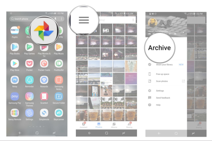 - Now, in order to see what all is there in your archive section, tap the three-line menu on top-left, and then tap Archive;