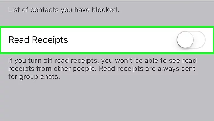- Now, it’s time to slide Read Receipts to the “Off” position. This green switch is at the bottom of the screen; sliding it left will disable read receipts in non-group conversations, which will therefore prevent the blue “Message Seen” ticks from appearing in any of your WhatsApp chats;