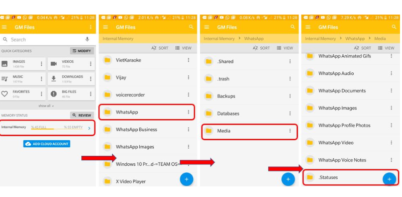- Select the WhatsApp folder -> Media->.Statuses. Open the .Statuses folder and here you will find all your WhatsApp video and images status of your friends that appeared on your mobile;