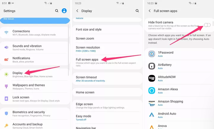 You can easily do this by going to your Settings menu and selecting Display > Full Screen Apps. You’ll see that the first option at the very top is Hide front camera. Just slide the switch next to Hide front camera to the On position.