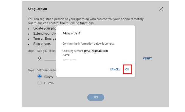 - Using an email address, enter the Samsung Account for your chosen guardian;