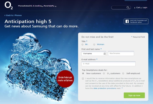 There is no mystery that Samsung Galaxy S5 is one of the most anticipated devices of 2014, but your waiting time has almost reached to an end. The smartphone is expected to debut later this month at the special Unpacked 5 event in Barcelona and a new teaser coming from O2 Germany suggests that it might be water resistant as well. Although the name of the device isn’t actually included there, the URL of the page is more than enough in order to understand that we are talking about Samsung Galaxy S5 and not any other upcoming handset. And the German carrier has also left us some clues saying that the new Samsung device will be unveiled at the end of February, once again making us think that it is indeed Galaxy S5.