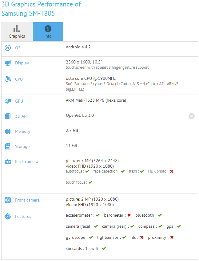 Moreover, we can tell you that the 10.5-inch AMOLED tablet will feature a screen resolution of no less than 2560 x 1600 pixels, which is the same resolution that we have also seen on the Galaxy Pro series of tablets. If we take in consideration the benchmark result, the SM-T805 LTE model is expected to come with a Samsung Exynos 5420 SoC with four Cortex A15 cores and four Cortex A7 cores, along with a hexa-core Mali-T628 GPU as well.