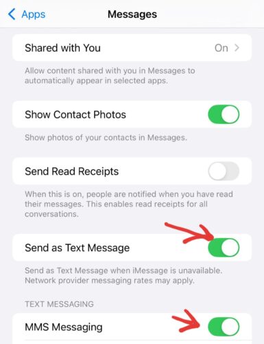 If “Send as SMS” is disabled, messages may never leave the iPhone when they can’t be delivered through iMessage. And if MMS is turned off, you won’t receive photos, videos, or group messages at all. Once these settings are corrected, ask them to resend the message.