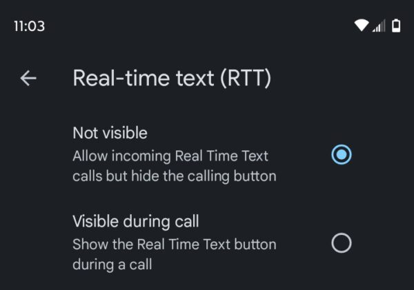 This turns off the RTT button completely. Other options include “Visible during call” (shows RTT only when you’re on a call) or “Always visible” (keeps RTT ready at all times).
