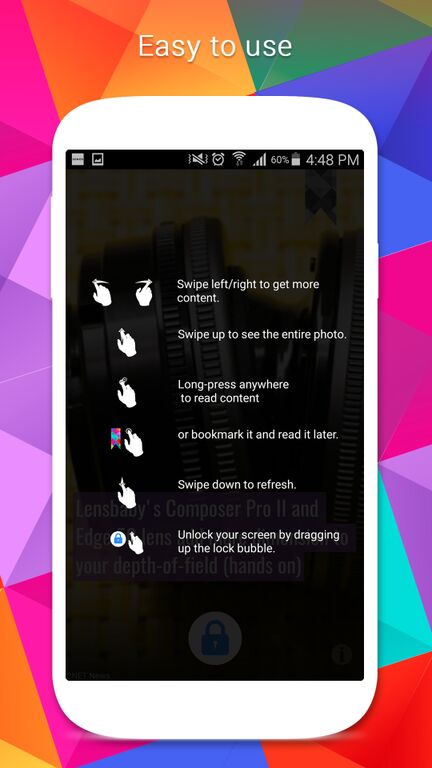 The initial setup is very brief, you’ll see a short on-boarding sequence – 3 slides that explain how you typically navigate throughout the lock screen – and the app is finally shown. From there, you can easily swipe through headlines, bookmark a story in order to read it later, and, of course, unlock your phone by dragging up the small locker bullet from the bottom of the Android screen.